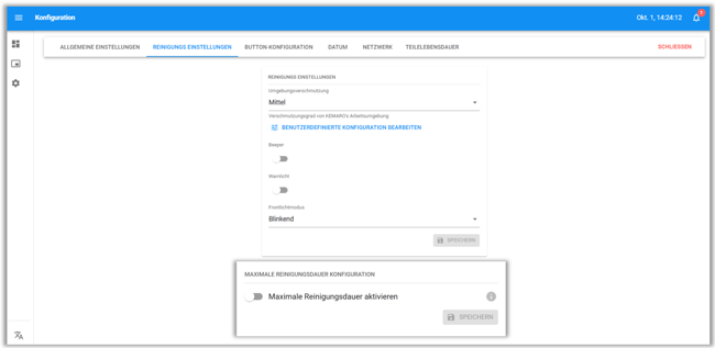 If you want to monitor when the dirt bin is full and receive a notification, you can set the maximum cleaning time in the . Wenn Sie überwachen möchten, wann der Schmutzbehälter voll ist und Sie benachrichtigt werden möchten, können Sie die Maximale Reinigungszeit in der KEMARO WebApp einstellen.