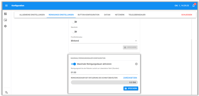 Da der Roboter keinen Sensor zur Füllstandsmessung des Schmutzbehälters hat, versichert die maximale Reinigungszeit dass der Roboter - nach einer vom Nutzer festgelegten Zeit - zur Ladestation zurückkehrt und den Nutzer mit Interaktion erforderlich benachrichtigt.