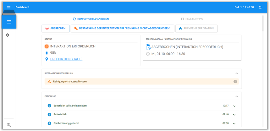 Level 2 | Fallrisiko. Gefälle oder Treppen sind vorhanden. | Der Roboter stoppt und bricht die Reinigung ab bis vom Nutzer bestätigt. |