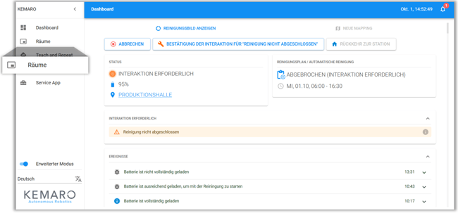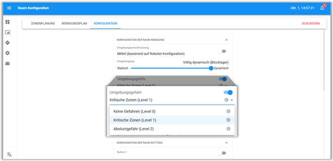 Umgebungsgefahren sind per Raum konfiguriert, da Räume sich im Sinne von Gefällen, Treppen oder beweglichen Objekten unterscheiden können. Diese Einstellungen je Raum zu pflegen garantiert optimale Sicherheit und Performance.