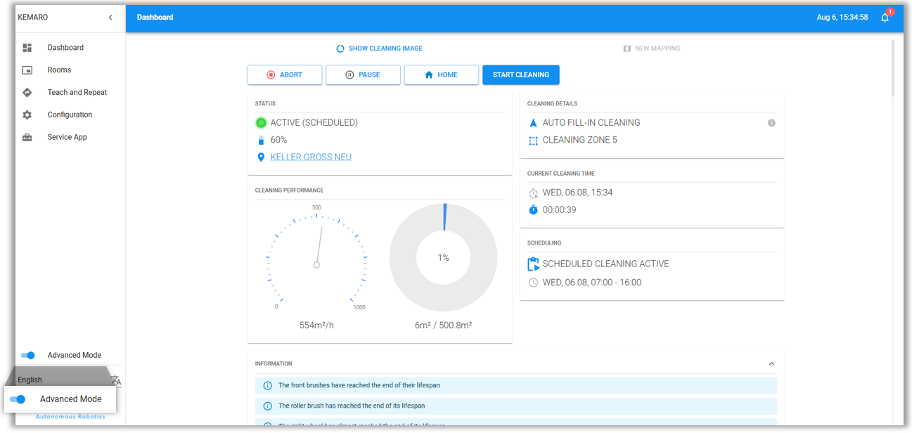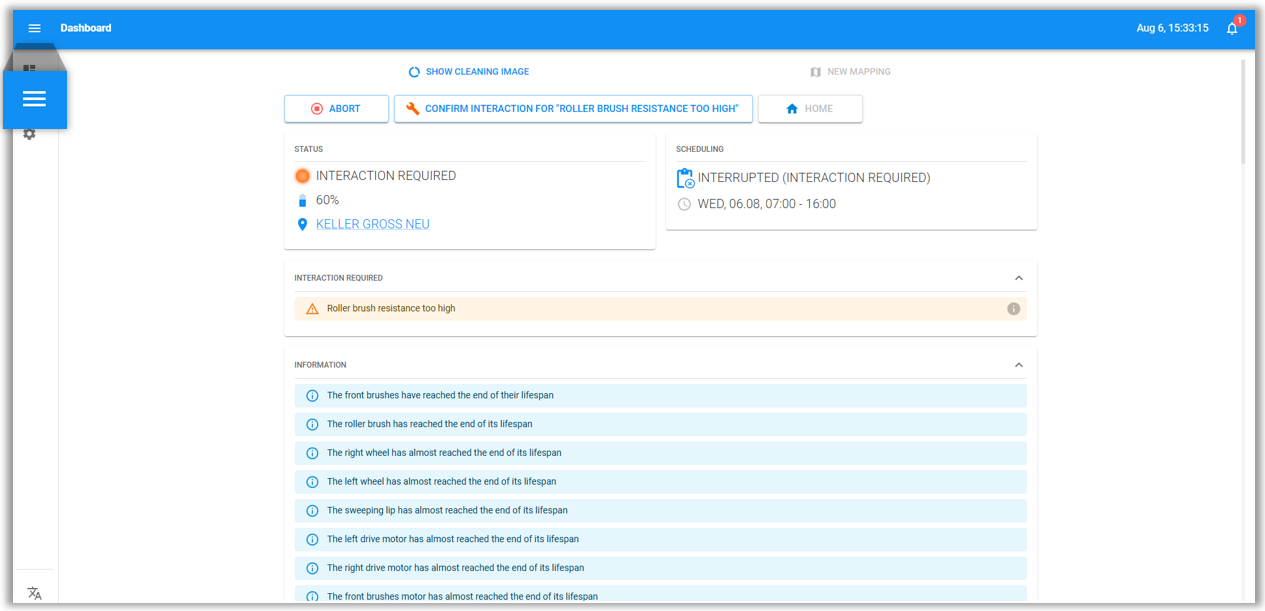 | Level 2 | Risk of falling. Drops or staircases are present. | The robot stops, it aborts the cleaning and waits for interaction from the user. |