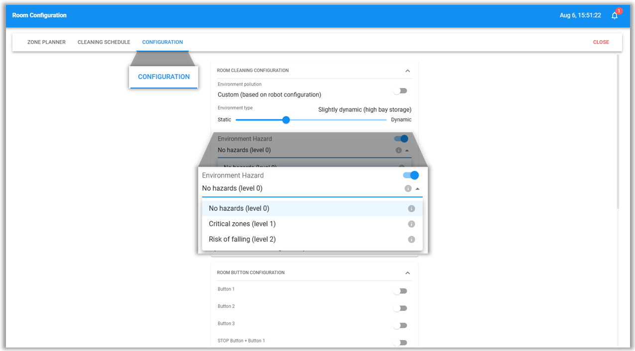 Environment hazard is configured per room, as each room may differ in terms of drops, staircases, moving objects, etc. Keeping the settings separate for each room ensures optimal safety and performance.
